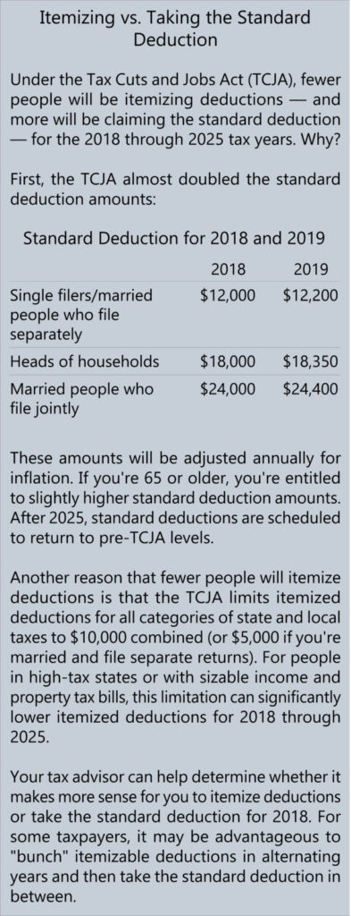 If you live in a jurisdiction with low or no personal income tax or you owe little or nothing to the state and local income tax collectors, you might consider deducting state sales taxes instead of state income taxes. However, this option only applies if you have enough itemized deductions to exceed your allowable standard deduction. (See “Itemizing vs. Taking the Standard Deduction” at right.)