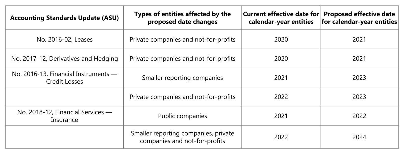 The following table summarizes key implementation date changes that the FASB unanimously voted to propose: